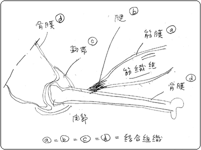 | 【参考】、同じ結合組織から成る、腱や靱帯、骨膜に施術しても同様な効果が得られるのでしょうか? 腱や靱帯、骨膜に対する施術では、筋膜に比べて微妙な操作が難しく、治癒反応の広がりを得る為には、筋膜への施術が圧倒的に有利になります。 |